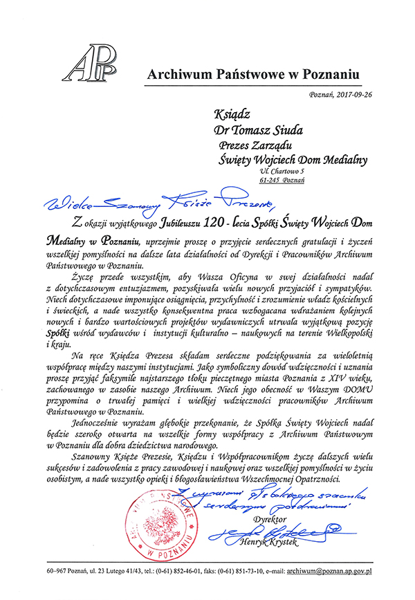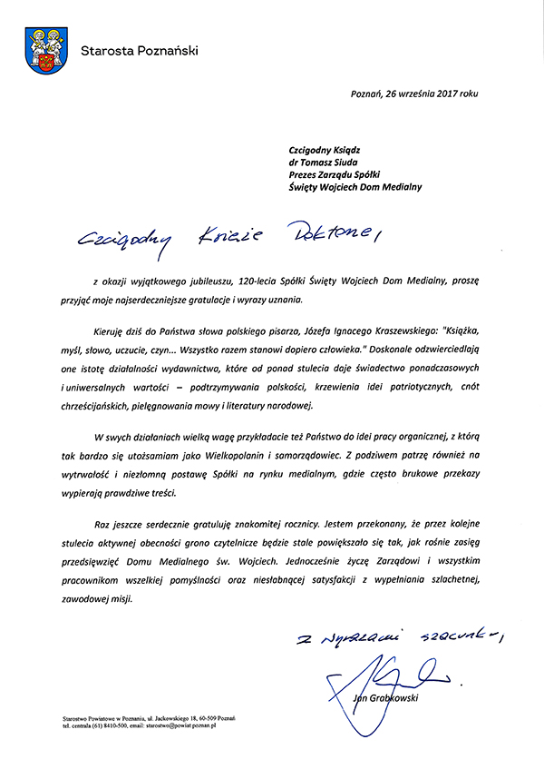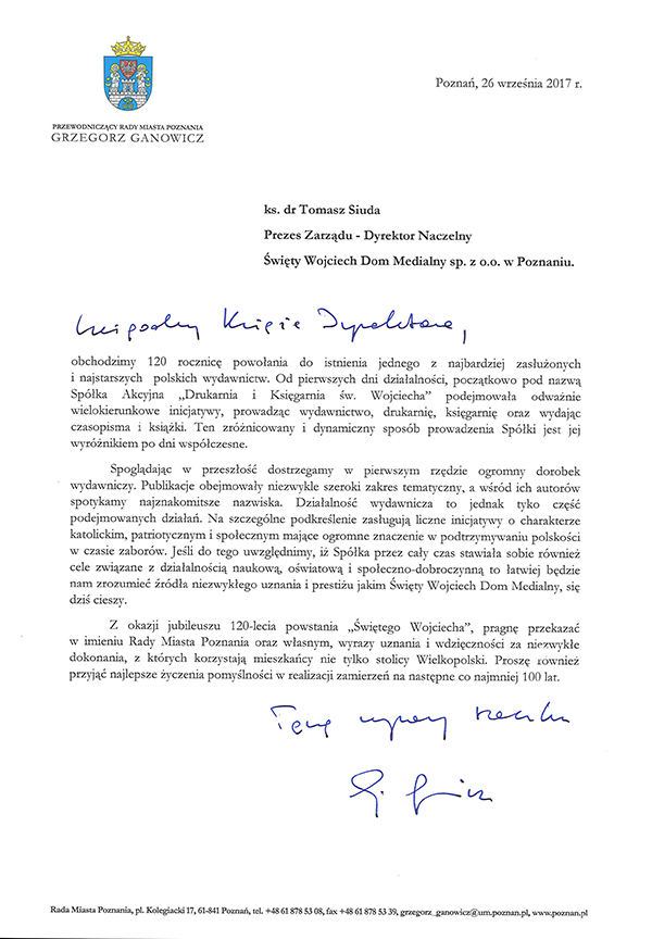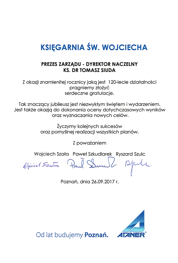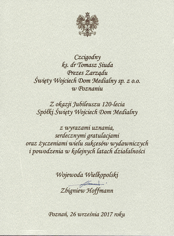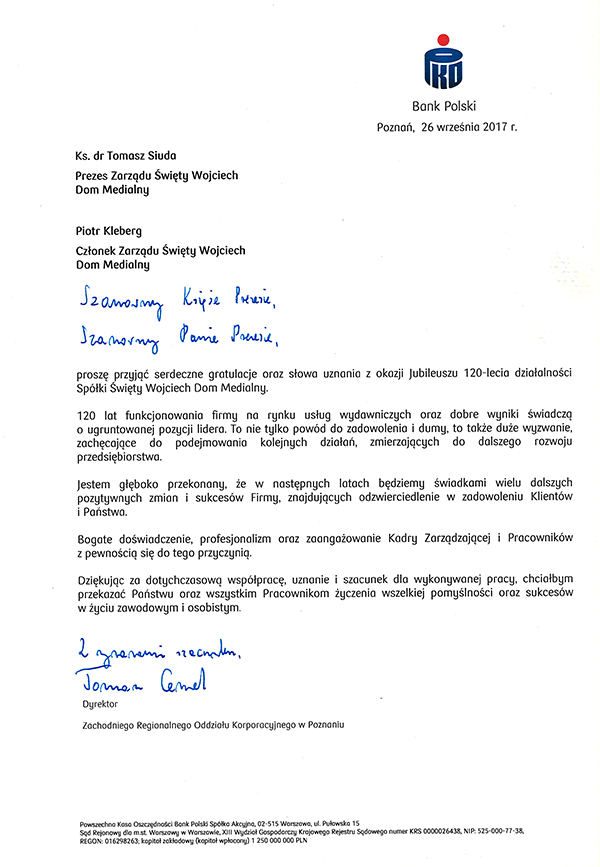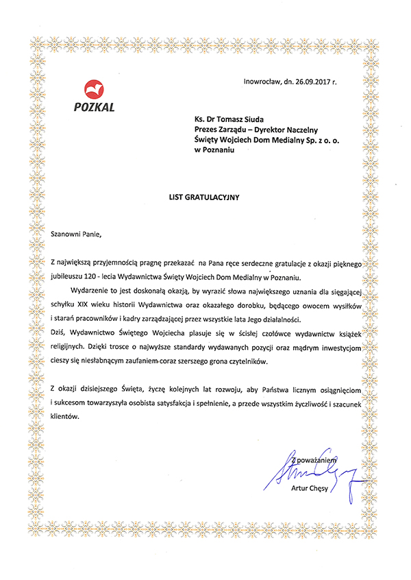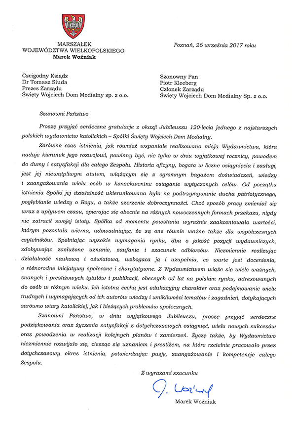 Jubileuszowe listy gratulacyjne 23.10.2017 W roku jubileuszu 120-lecia istnienia, spółka Święty Wojciech Dom Medialny otrzymała liczne listy gratulacyjne od instytucji, firm oraz osób prywatnych i publicznych. Poniżej prezentujemy niektóre z nich. « PoprzedniaNastępna »