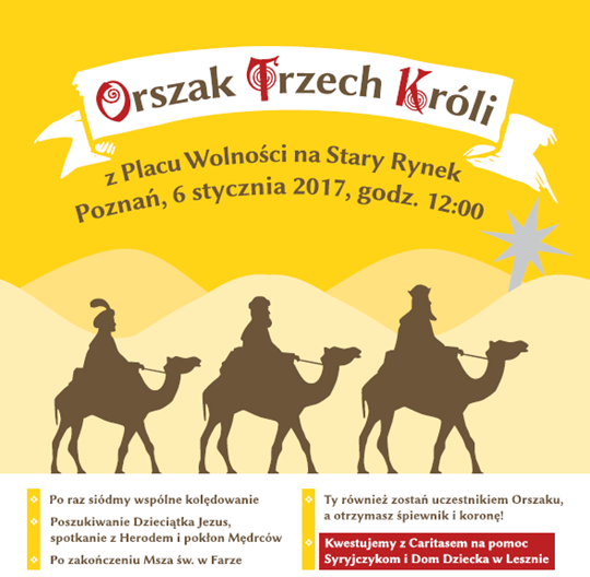 W piątek 6 stycznia 2017 roku po raz siódmy ulicami poznańskiego Starego Miasta przejdzie Orszak Trzech Króli! Zapraszamy rodziny z dziećmi, młodzież, studentów, seniorów do wspólnego świętowania i kolędowania.