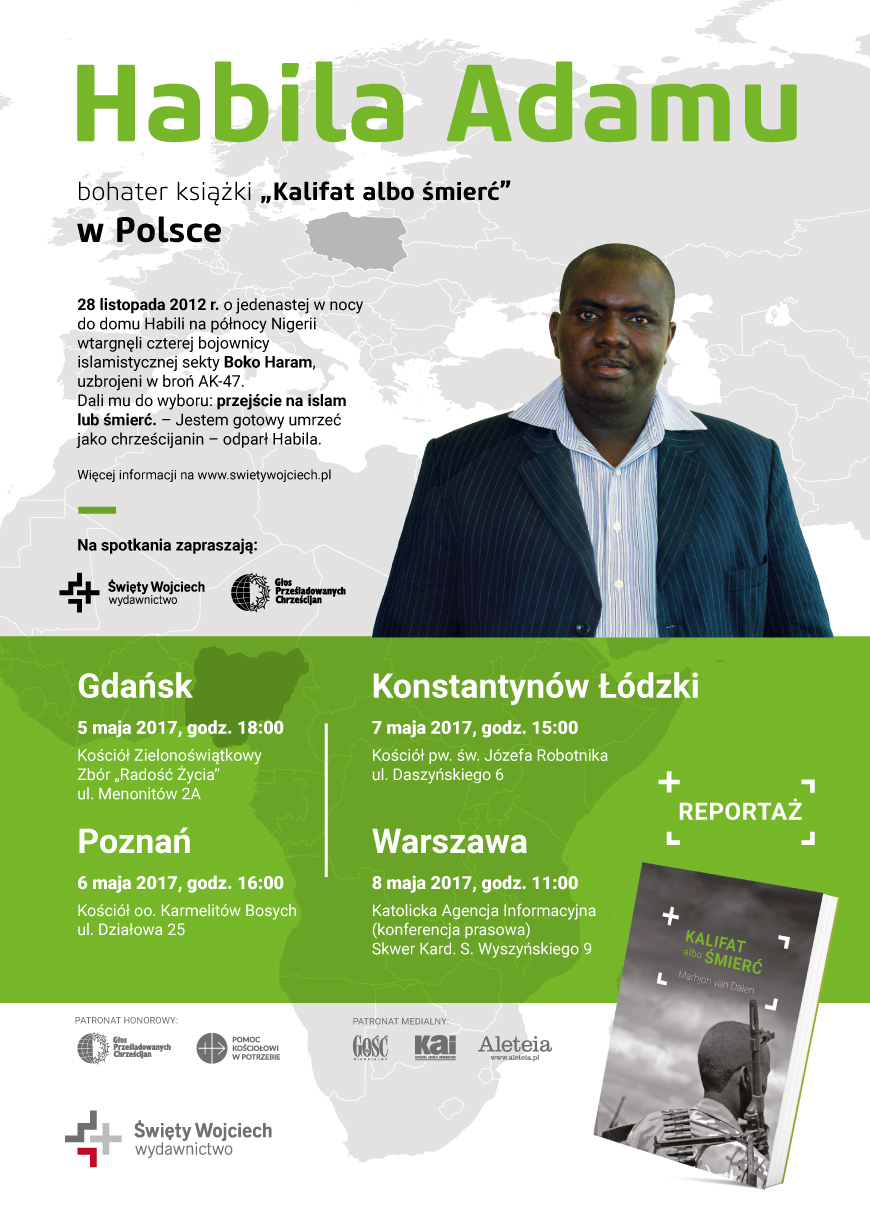 Na zaproszenie Wydawnictwa Świętego Wojciecha oraz Stowarzyszenia Głos Prześladowanych Chrześcijan Polskę odwiedzi Habila Adamu. Spotka się ze wszystkimi, którym los prześladowanych nie jest obojętny i będzie głosem tych, którzy oddali swoje życie w imię Jezusa Chrystusa. Opowie o ataku na niego i jego rodzinę oraz o cudownym uzdrowieniu przez Boga.